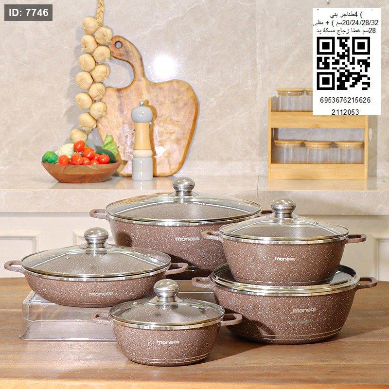 4 طناجر بني 32/28/24/20 +مقلى 28سم غطاء زجاج مسكة يد