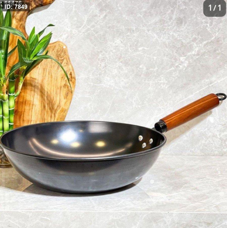 مقلى صاجيه 33سم المنيوم اسود يد خشب طويل K87/1=ض8