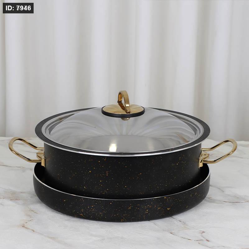 طنجرة مقلوبه 28سم + سدر 32سم جرانيت اسود غطاستانلس بيدين ذهبي + ط