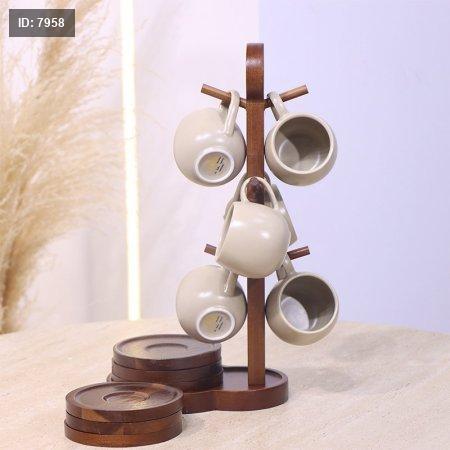 طقم فناجين قهوه بورسلان بيج ماط 6/6 مع ستاند خشب بني غامق YM25043++ع1