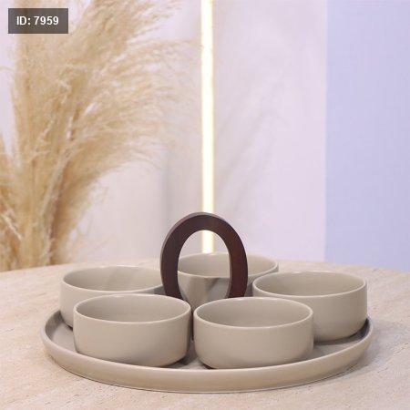 طقم مضيفه صنيه يد خشب +5 صحون مكسرات بورسلان بيج ماط YM14580++ع 1