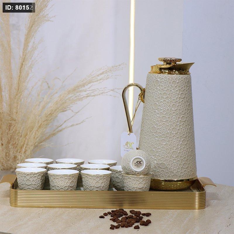 طقم/14 تيرموس قهوه +12فنجان ساده بورسلان بيج +صنيه ذهبي KHAKl-BW06-14S++9